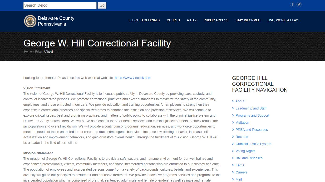 George W. Hill Correctional Facility Home / Prison / About Looking for an Inmate: Please use this web external web site: https://www.vinelink.com Vision Statement The vision of George W. Hill Correctional Facility is to increase public safety in Delaware County by providing care, custody, and control of incarcerated persons.